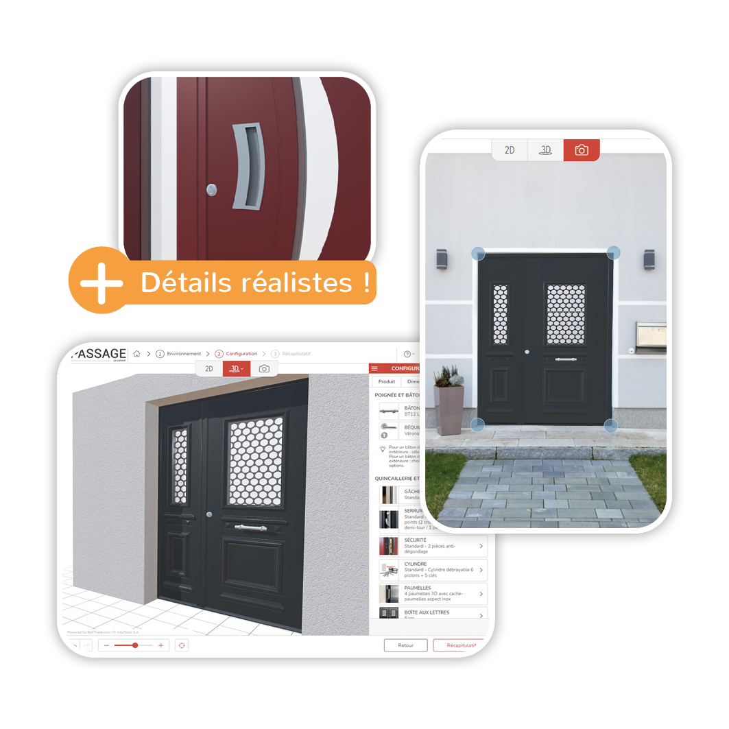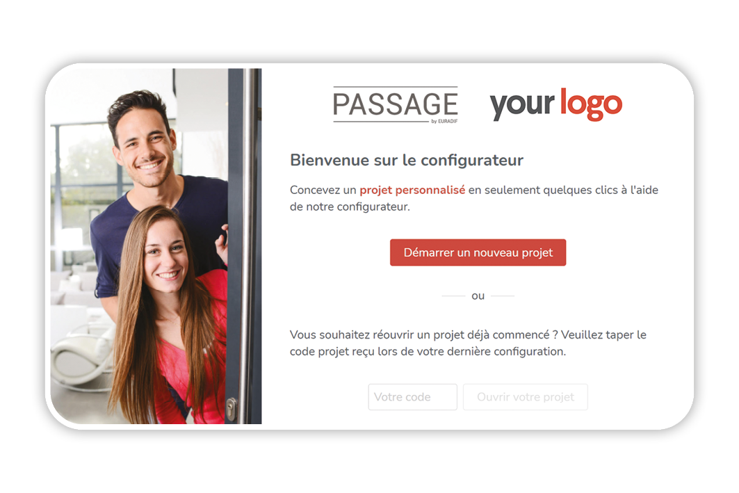 Vous intégrez le bouton Configurateur de porte sur la page d’accueil de votre site Internet.                                      Nous vous fournissons l’URL de votre configurateur 3D PASSAGE pour le grand public, personnalisé avec votre logo et vos couleurs.
