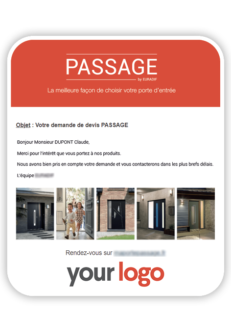 Après avoir complété un formulaire de contact, le consommateur reçoit une notification par mail personnalisée à votre image, lui signifiant que vous prendrez contact avec lui rapidement.