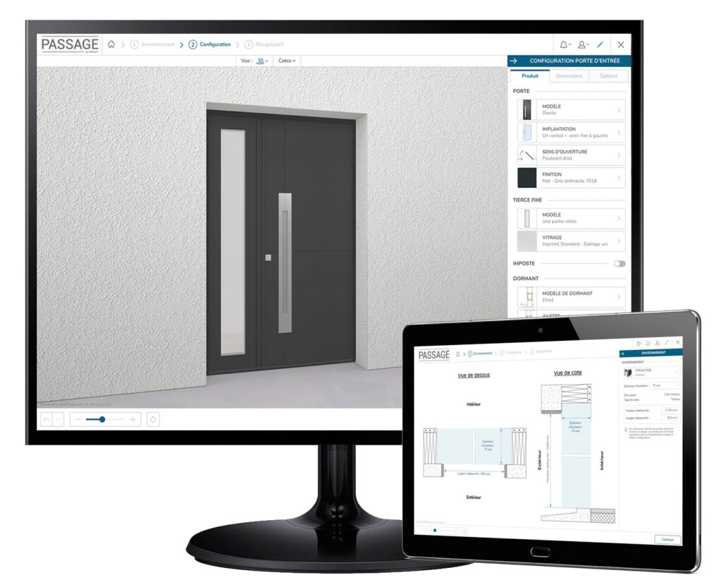 Gagnez en efficacité grâce à notre configurateur 3D professionnel. En quelques minutes, vous réalisez une configuration complète de porte d’entrée, projetez votre création sur la façade du client et validez la commande en ligne.