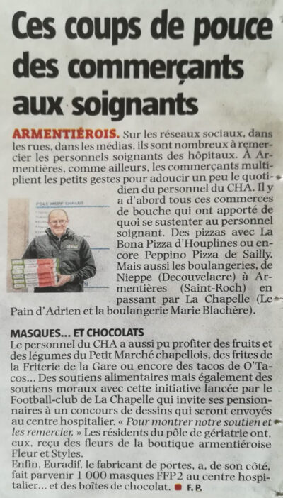 En solidarité avec le personnel soignant face à l’épidémie de Coronavirus et pour faire face aux difficultés d’approvisionnement de masques, EURADIF a fait don de 1000 masques FFP2 au centre hospitalier d’Armentières… et de boîtes de chocolats.
