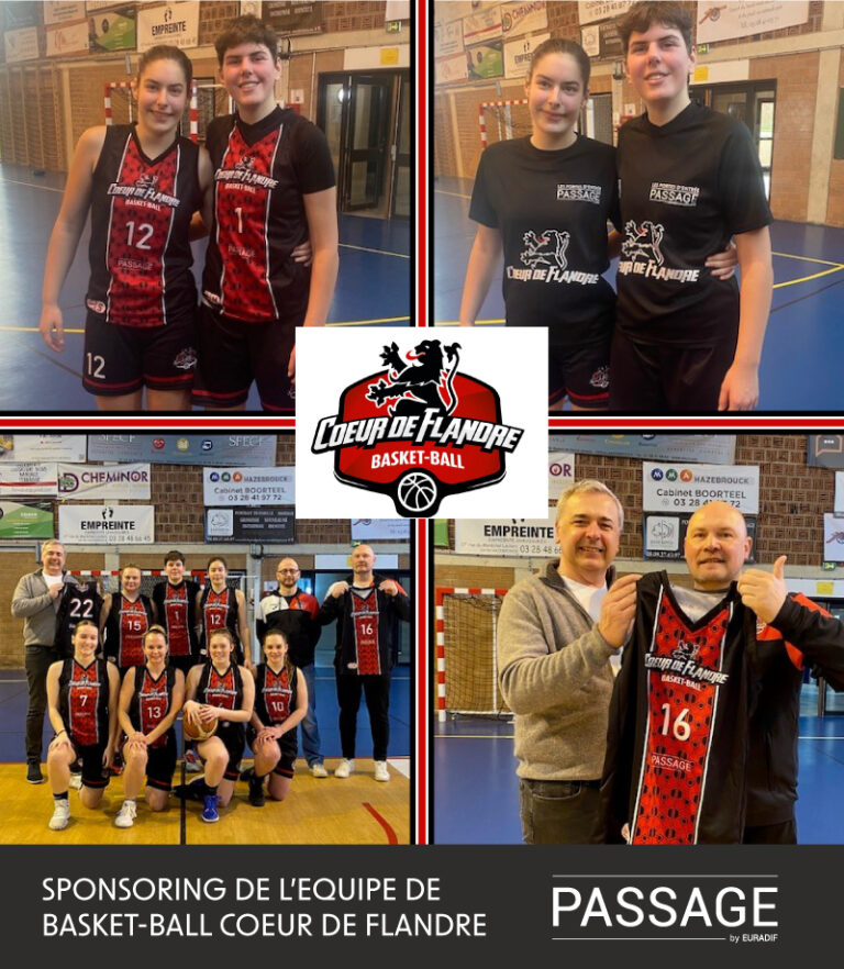 Nous sommes enchantés de renouveler notre soutien à l’équipe Cœur de Flandre Basket-Ball en leur fournissant de tout nouveaux maillots et surmaillots floqués PASSAGE by EURADIF.