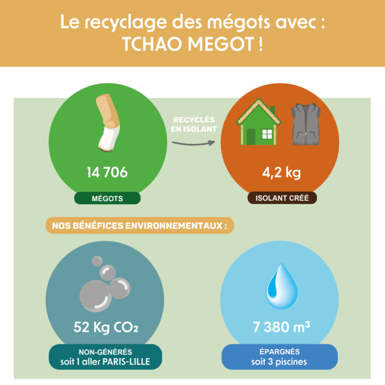 TchaoMegot est une entreprise des Hauts-de-France qui traite les mégots pour les recycler en isolant éco-conçu pour le textile et le bâtiment. Cette démarche s’inscrit dans l’économie circulaire en réduisant les impacts toxiques dans la nature et en évitant de puiser dans les ressources de la planète pour la fabrication d’un isolant.