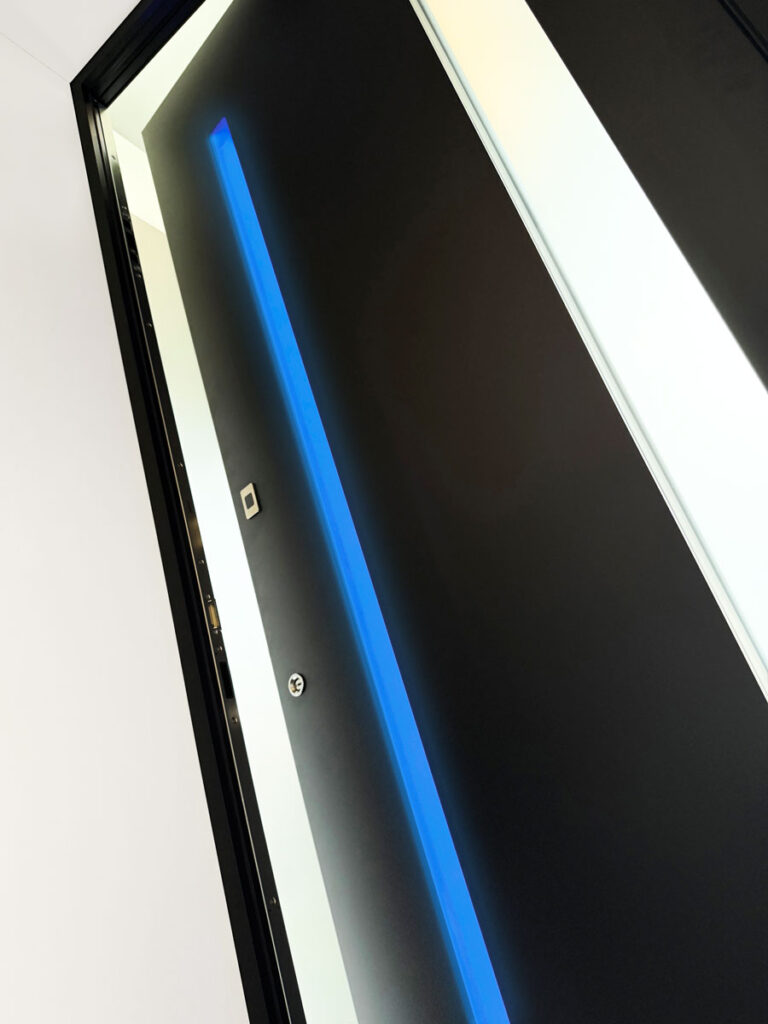 C’est le cas notamment de modèles comme GRAPHITE, qui propose une poignée intégrée avec éclairage LED personnalisable, contrôlable à distance. Un détail à la fois pratique et résolument moderne, qui donne à la porte un style unique et une signature lumineuse inimitable.