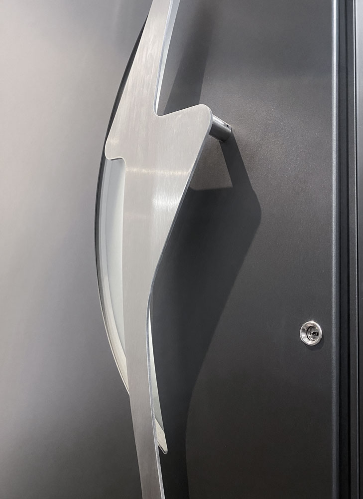 Élancée et raffinée, la poignée design du modèle Aspiration se distingue par ses lignes à la fois douces et dynamiques. Réalisée en aluminium brossé, elle parcourt toute la hauteur de la porte et en souligne la verticalité. Son design fluide capte la lumière et renforce le caractère contemporain de l’ensemble, entre élégance et ergonomie.