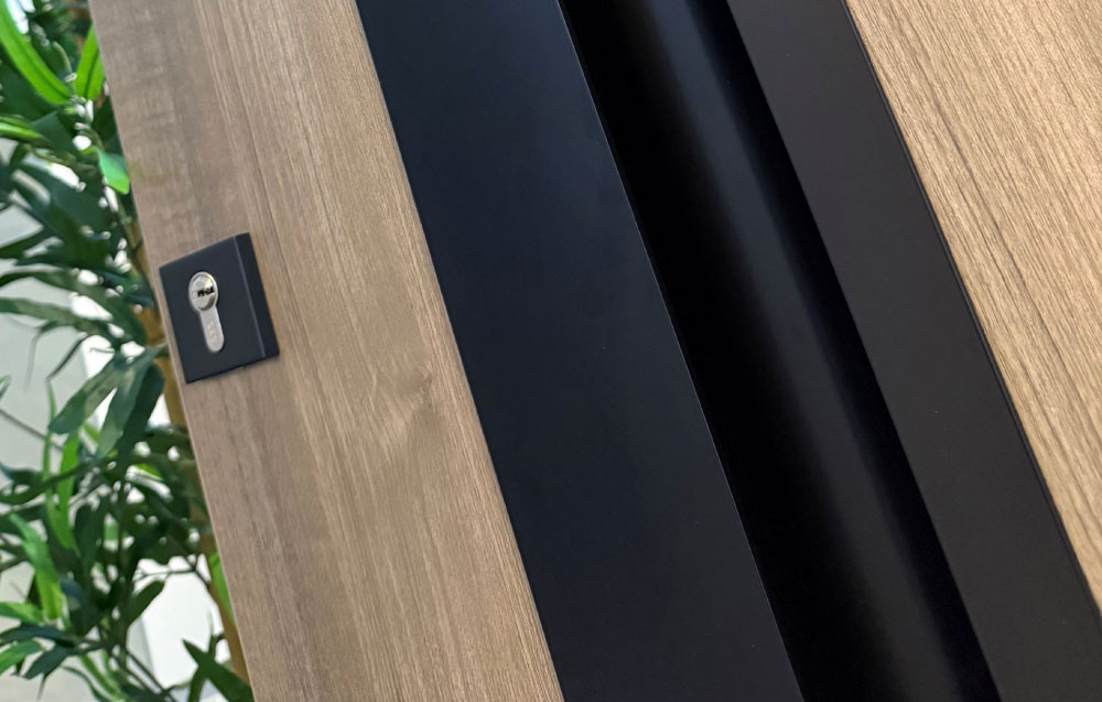 Le modèle Cherry séduit par sa poignée incrustée noire, intégrée directement dans la surface de la porte pour une esthétique fluide et contemporaine. Ce contraste marqué avec le décor bois renforce le caractère design de cette porte d’entrée en aluminium, alliant sobriété, élégance et modernité.