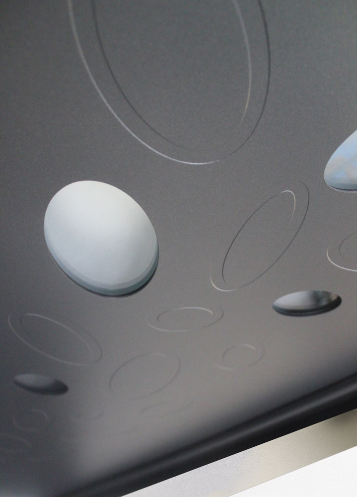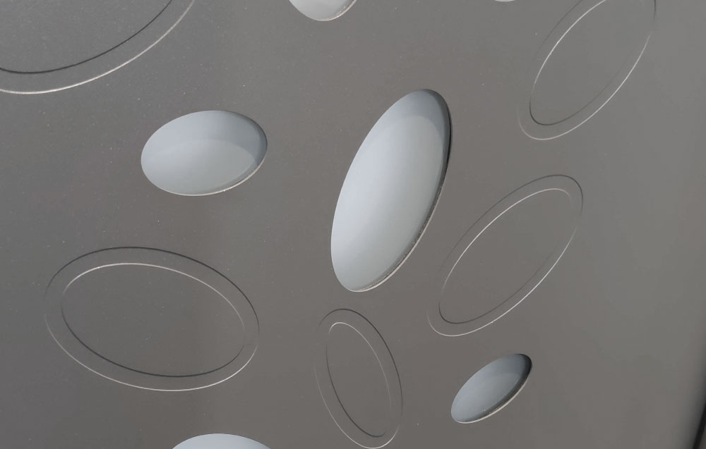 Un ensemble harmonieux de vitrages ovales forme un jeu visuel dynamique, prolongé par des rainurages assortis qui créent un subtil écho entre lumière et relief.