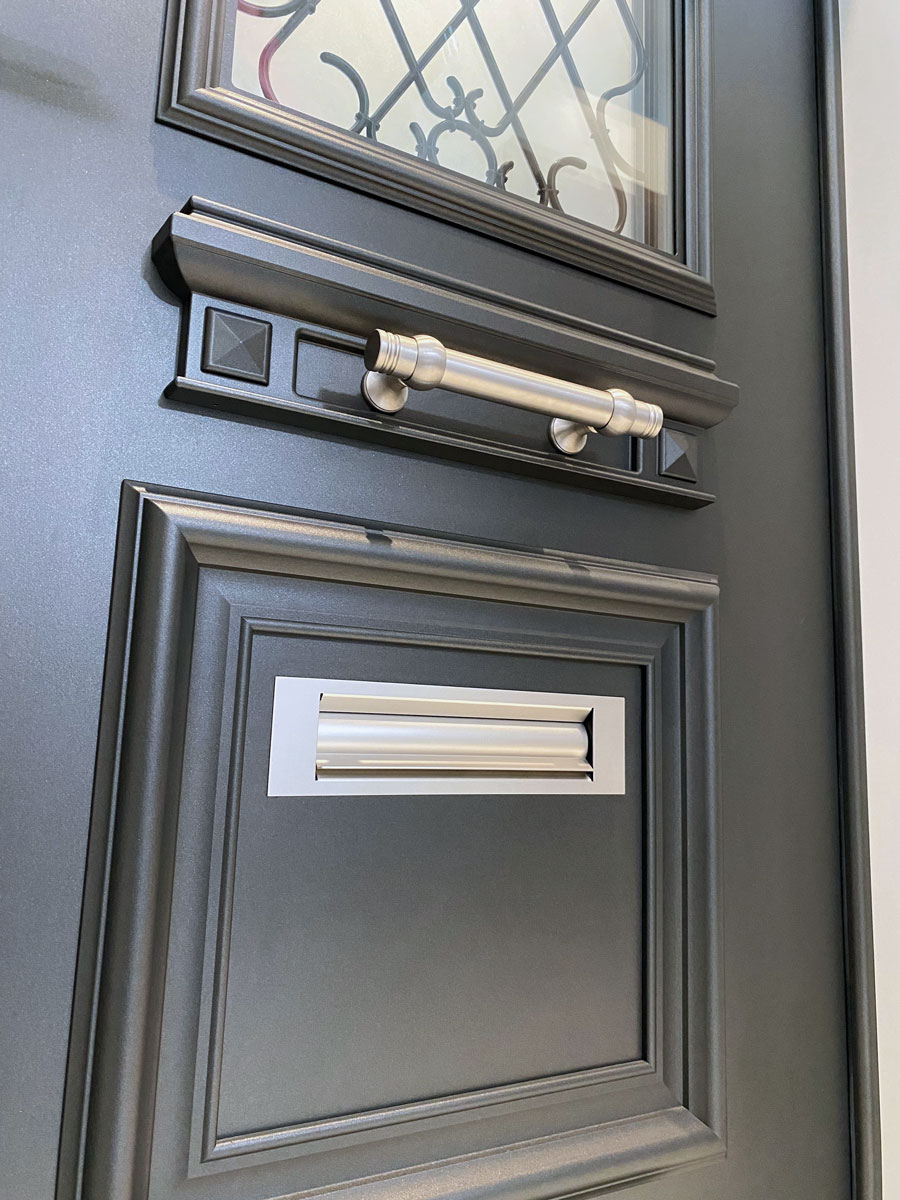 Le modèle Spencer illustre la maîtrise du détail avec ses moulures et cimaises finement dessinées. Chaque relief capte la lumière et souligne la profondeur du design, conférant à cette porte d’entrée en aluminium un caractère noble et intemporel. Une pièce de prestige où l’élégance classique s’allie à la modernité des matériaux.
