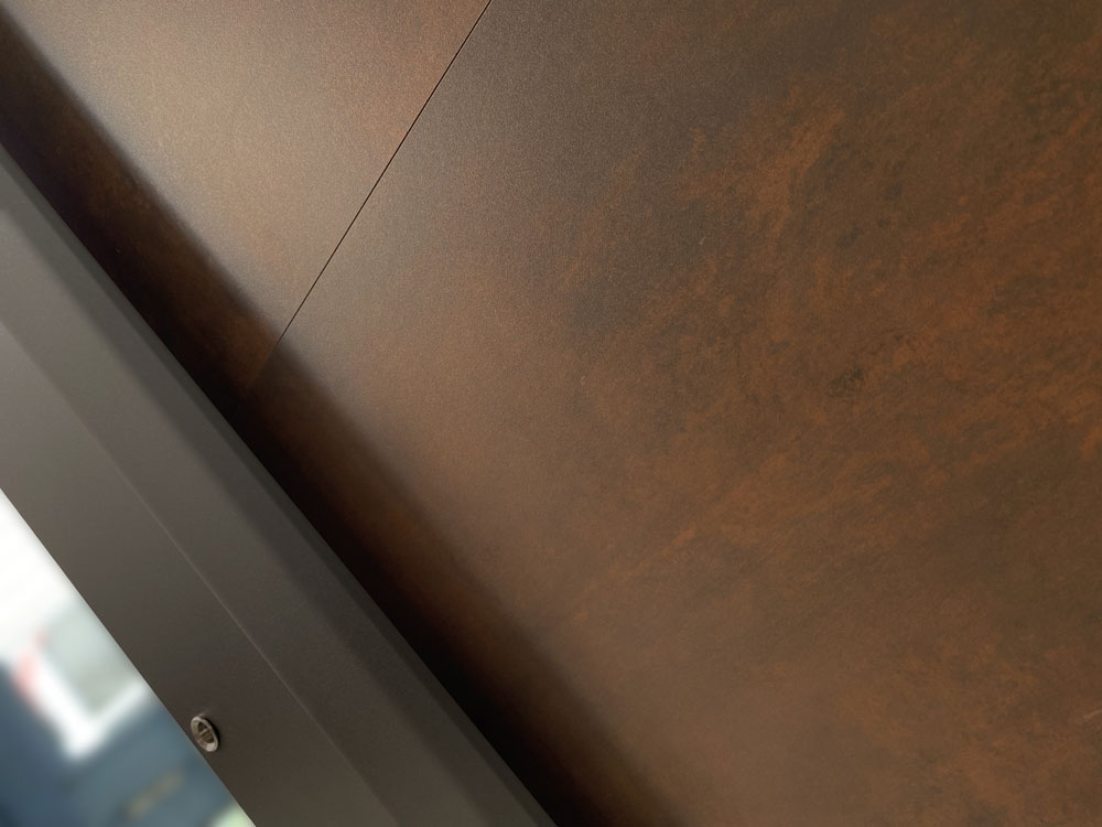 La porte Stamnos se distingue par sa poignée intégrée dotée d’un éclairage LED RGB, qui sublime les nuances naturelles du parement céramique. Cet éclairage, personnalisable selon l’ambiance souhaitée, met en valeur les reflets de la matière et accentue le relief minéral de la surface.