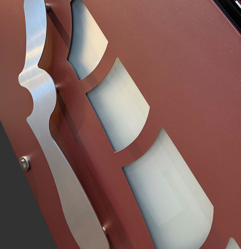 Le modèle Vesta 7 se distingue par sa poignée originale, véritable élément sculptural intégré à la porte. Sa forme galbée et fluide épouse les lignes du vitrage courbé, créant un équilibre parfait entre esthétisme et ergonomie. Réalisée en aluminium brossé, cette poignée incarne à la fois modernité et singularité, apportant une touche artistique à votre entrée.